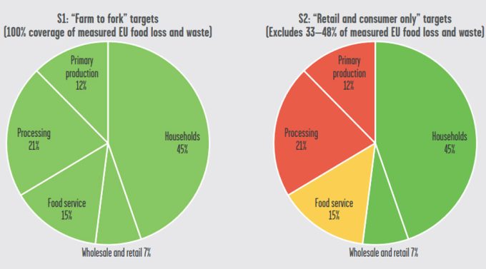 Hay que destacar que la organización explica que las cifras oficiales de la UE excluyen una gran parte del desperdicio alimentario que se produce en las granjas, así como en los informes que proporcionan los países miembros, lo que no resulta nada bueno si se pretende trabajar con cifras reales y poner en marcha verdaderas soluciones. Se calcula que un 20% de la producción alimentaria comunitaria se desperdicia en la actualidad, si se lograra reducir ese desperdicio un 50% para el año 2030, se reducirían las emisiones de gases de efecto invernadero, mejoraría la seguridad alimentaria, ya que se ahorrarían 4’7 millones de hectáreas de tierras de cultivo, se reduciría el gasto energético, el gasto de recursos de gran valor como el agua, etc.