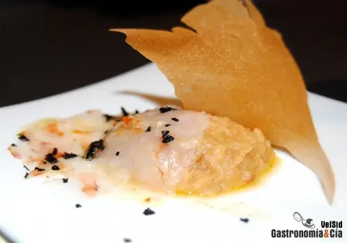 No falta la aportación de volumen y la textura crujiente en la tapa, que viene dada por un fino crujiente de langostino. Un plato muy equilibrado y radiante expresando el sabor del mar.