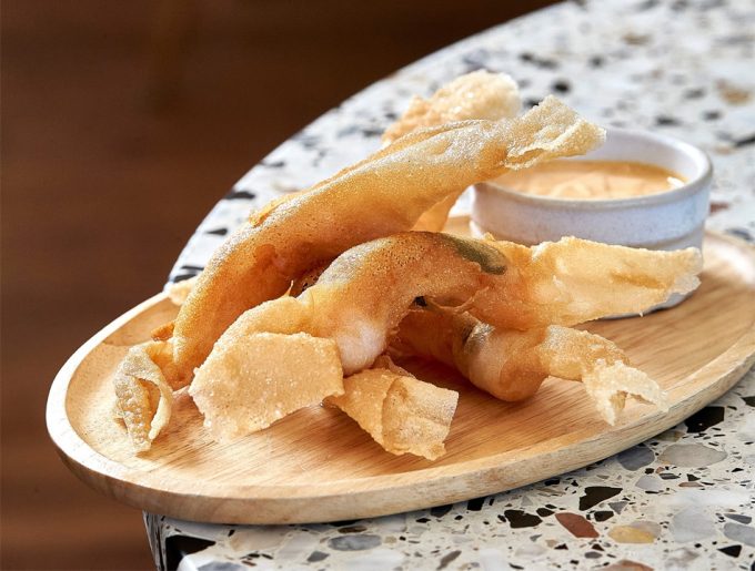 Servimos los Langostinos Robuchon recién hechos, calientes y crujientes, acompañados de la mayonesa picante.