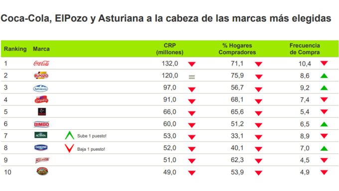 De las tres primeras marcas, destaca El Pozo que ha logrado una mayor presencia en los hogares españoles con una cuota de penetración del 73’6%, también destaca Central Lechera Asturiana por haber alcanzado los 97’99 millones de contactos con el consumidor y además ha aumentado su presencia en los hogares españoles. Por otro lado, Coca Cola ha logrado ganar dos territorios según el ranking regional, y se coloca como líder destacado en las Comunidades Autónomas.