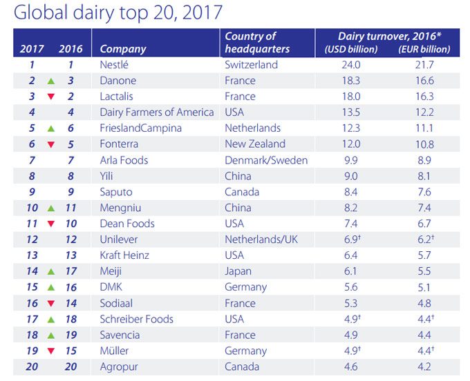 En The Global Dairy Top 20 2017 no hay nuevas compañías, aunque sí se han producido movimientos en el ranking, por ejemplo, compañías como Danone, que tras dos años de recesión se ha recuperado y se coloca de nuevo en la segunda posición de esta clasificación. Rabobank comenta que la variación del precio de la leche y la limitación del volumen producido han provocado que las compañías se centren más en la estrategia de valor que en la estrategia de volumen.