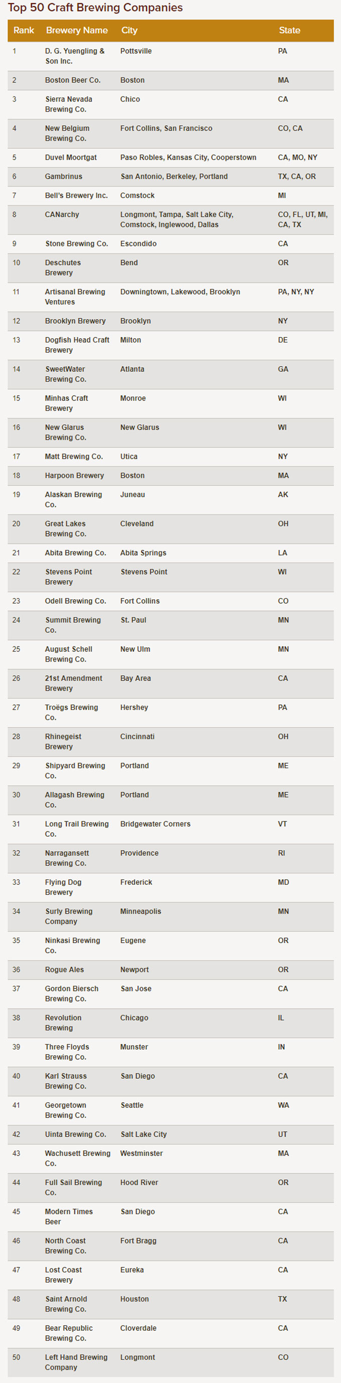 Seguidamente, podéis ver la lista de las 50 Mejores Cerveceras Artesanas del país según la Brewers Association: