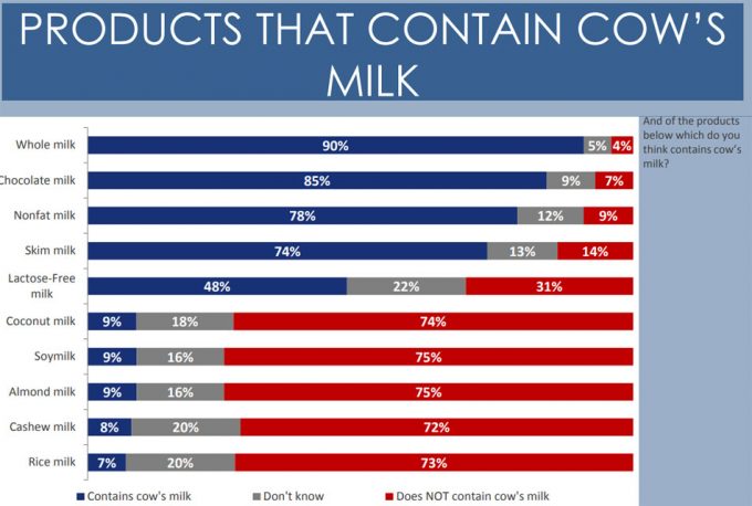 Según una encuesta realizada por la Fundación del Consejo Internacional de Información Alimentaria (IFIC) de Estados Unidos, cuya misión es comunicar de manera efectiva información científica sobre salud, nutrición y seguridad alimentaria a los consumidores, entre un 7% y un 9% de estadounidenses creen que las bebidas vegetales contienen leche de vaca. A esto hay que añadir que entre un 16% y un 20%, dependiendo de la variedad de bebida vegetal, no saben si contiene leche de vaca, lo que demuestra que existe confusión sobre la composición de las bebidas vegetales.