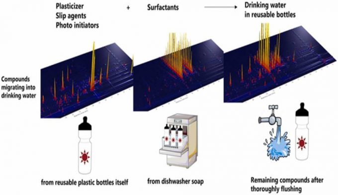 Cuando el agua pasa un tiempo en una botella de plástico reutilizable, en algunos casos se puede apreciar un sabor diferente, de ahí que se pusiera en marcha este estudio. En la investigación, los expertos analizaron el agua de las botellas de plástico reutilizables 24 horas después de haber sido llenadas con agua del grifo, los resultados mostraron más de 400 sustancias diferentes procedentes del envase, y más de 3.500 sustancias derivadas del jabón para el lavavajillas, porque periódicamente las botellas reutilizables se suelen lavar, sea a mano en el fregadero o en el lavavajillas.