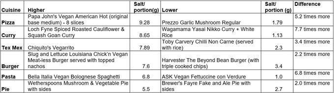 Para Action on Salt resulta sorprendente la variación en el contenido de sal de comidas similares servidas en diferentes restaurantes, ya que es un ejemplo de que la sal no es necesaria para proporcionar sabor. Se apunta que algunos establecimientos ofrecen platos veganos o vegetarianos muy sabrosos, que tienen hasta siete veces menos sal que los homónimos que ofrecen sus competidores. Esto demuestra que con un poco de voluntad, quienes abusan de la sal pueden reducir fácilmente su contenido y ofrecer comidas realmente más saludables. A continuación, podéis ver algunos ejemplos de platos similares de diferentes cadenas y las diferencias del contenido de sal, como podréis comprobar, se trata de diferencias muy elevadas.