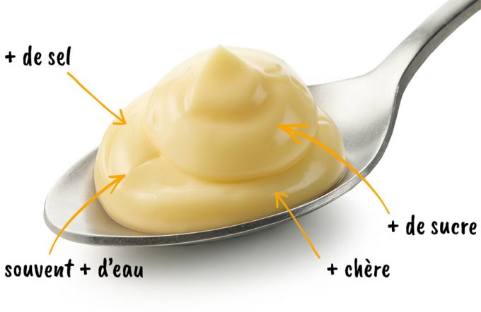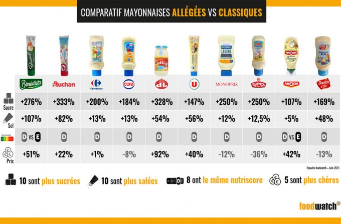 Las marcas analizadas por Foodwatch son: Amora, Auchan, Bénédicta, Bouton d’or (Intermarché), Carrefour, Cora, Devos & Lemmens, Monoprix, Rustica y Super U. Como podéis ver en el dibujo, el abuso de azúcares añadidos es exagerada y supera como mínimo el 100% en comparación con la versión homónima. Destacamos, por ejemplo, la mayonesa light Auchan que tiene nada menos que un 333% más azúcar que su versión clásica.