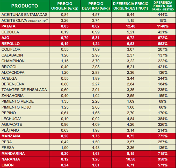 Las patatas siguen encabezando el ranking de las diferencias especulativas de precio, la diferencia porcentual se estableció en febrero en un 1.140%, recordemos que en el mes de enero llegó a alcanzar el 1.450%. En origen se ha mejorado (si es que se puede llamar mejora) el precio que se paga a los agricultores, 5 céntimos por kilo de patatas, uno más que en el mes de enero. Los consumidores hemos seguido pagando lo mismo en el mercado, una media de 0’62 euros por kilo, por lo que pagamos 12’40 veces el valor de las patatas en el campo. Ya son siete meses consecutivos en los que este alimento lidera este particular ranking y cada vez más agricultores manifiestan su deseo de abandonar este cultivo por la nula rentabilidad que ofrece.