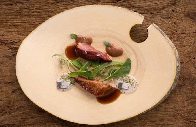 Pichón macerado en algas con emulsión de kalamata, hierbas de las marismas y crema de sardinas de Nacho Manzano