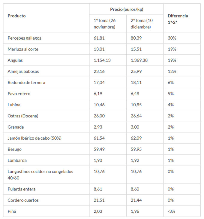 Como podéis ver (o dejamos por escrito para quienes hacen uso de un lector), el producto que más ha subido de precio son los percebes gallegos, que han pasado de 61 a 80 euros, por lo que el aumento de precio se cuantifica en un 30%. Claro, que este producto no es de los más extendidos en las mesas navideñas de los españoles, se consume mucho más la merluza, las almejas, el redondo de ternera, etc.