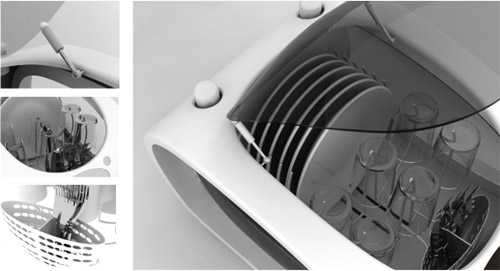 Este lavavajillas mini diseñado Ibsen Caldas fue galardonado con el primer premio Whirlpool Innova 2008, se llama Gota y tiene otra ventaja, además de disponer hasta de prelavado, es un lavavajillas ecológico que recicla el agua el agua residual en los siguientes ciclos.