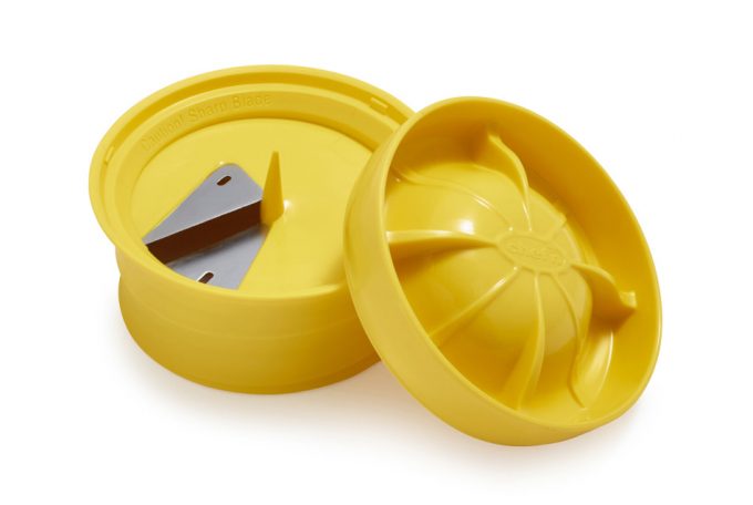 Las dimensiones de este cortador de cítricos en espiral son de cerca de 8 centímetros de diámetro y algo más de 5 centímetros de alto, y está fabricado en polipropileno, polioximetileno y acero inoxidable. Con un uso correcto debería durar toda la vida, pues parece ser que la garantía de este utensilio es ilimitada. Ahora bien, la recomendación es lavarlo a mano, de modo que se mantiene mejor la cuchilla, pero también se puede poner en la parte superior del lavavajillas.