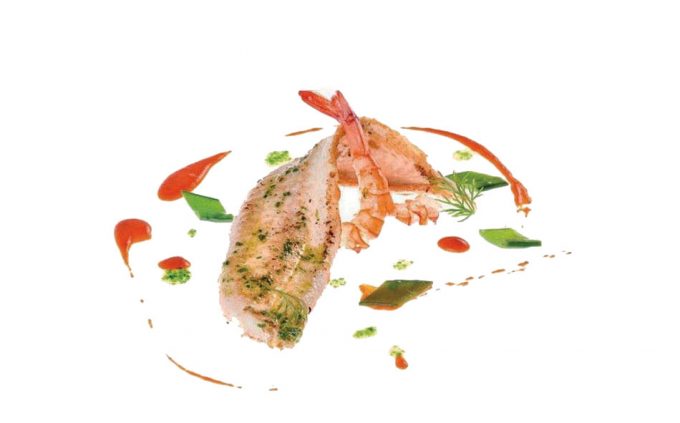 Disponemos en el plato un lomo de lenguado con la gamba roja confitada y decoramos con los tirabeques, el bisque y un poco de majado de ajo y perejil.