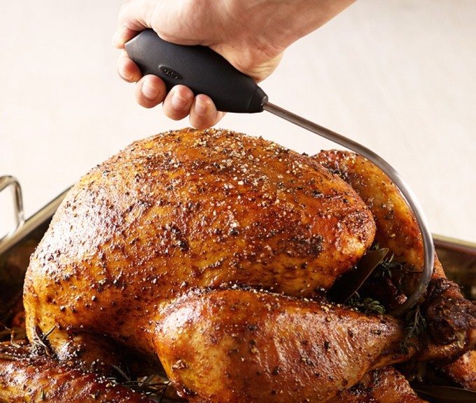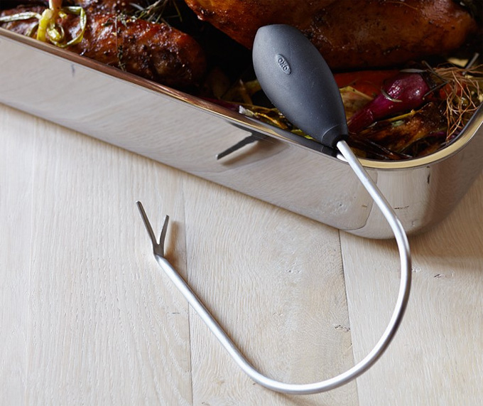 El levantador de pollos o pavos asados de OXO, como veis, es muy sencillo, se trata de una herramienta fabricada en acero inoxidable muy resistente con un mango antideslizante de material plástico. Tiene una forma curvada para proporcionar estabilidad a la hora de levantar el ave, la idea es introducirla para sostenerla desde el interior, por el esternón, anclando la punta para más seguridad, aunque nos parece una carne muy blanda una vez cocida como para que sea un seguro.