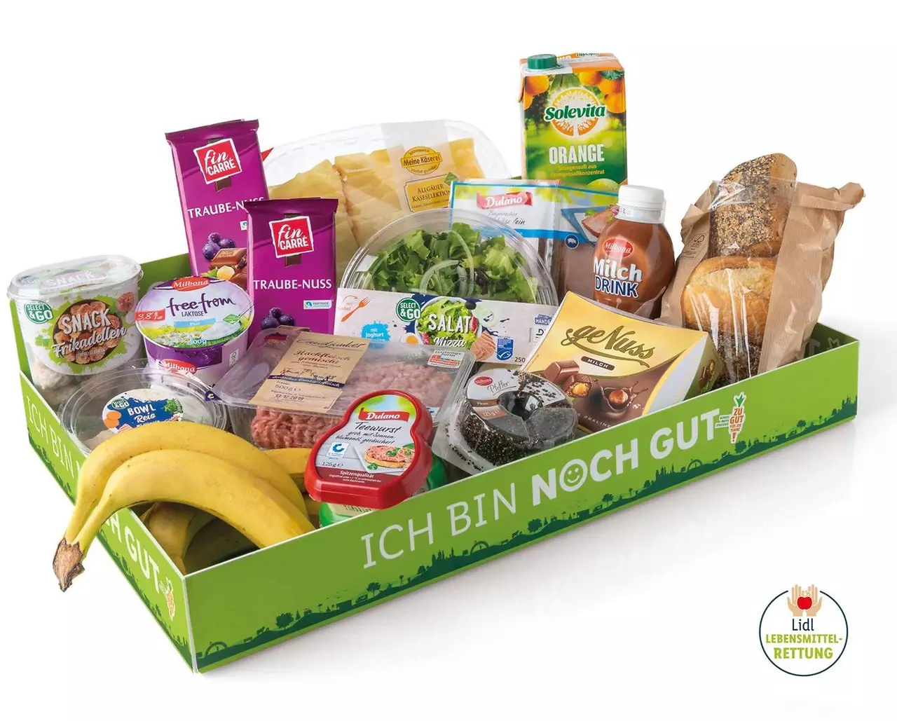 Como se puede ver en la fotografía, las cajas Lidl son de color verde y tienen impreso el mensaje Ich bin noch gut (Todavía estoy bien), en ellas se incluirá todo tipo de productos de alimentación, pan, alimentos cárnicos, frutas, salsas, chocolates, bollería, verduras, quesos, productos congelados, alimentos preparados, etc. Las cajas se colocarán en puntos estratégicos junto a artículos promocionales a fin de captar la atención de los clientes, su contenido irá variando dependiendo de los productos alimenticios a los que les falten unos días para caducar, por lo que probablemente algunos días la oferta de las cajas será mucho más interesante.