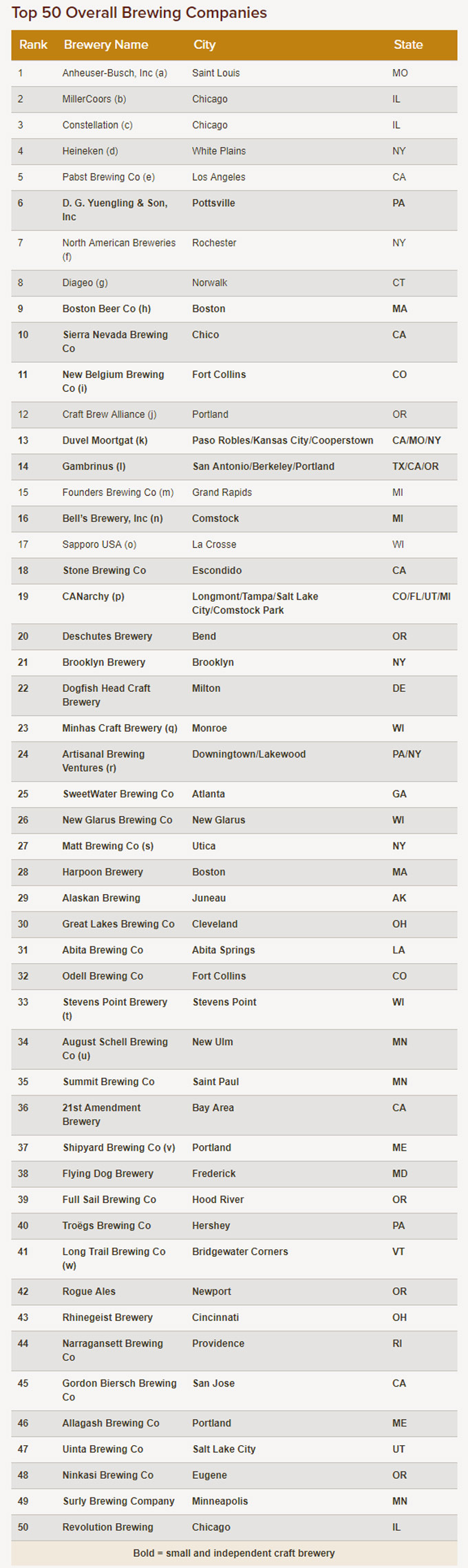 A continuación podéis ver un listado con las 50 Mejores Compañías de Cerveza de Estados Unidos a nivel general, se puede comprobar que sigue manteniendo la primera posición la cervecera industrial Anheuser-Busch, Inc., considerada la mayor del mundo hasta que paso a formar parte empresa belgo-brasileña inBev, considerada el mayor fabricante del mundo de cerveza por volumen. En este listado dominan las cerveceras industriales, sin embargo las cerveceras artesanales tienen una notable y consolidada presencia.