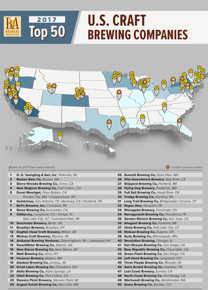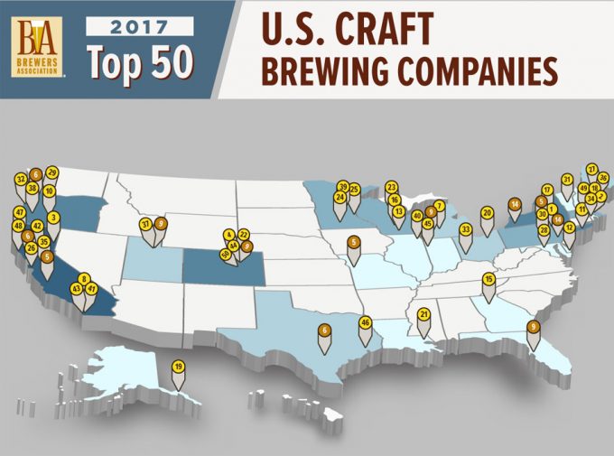La Asociación de Cerveceros de Estados Unidos (Brewers Association) acaba de publicar la lista de las 50 Mejores Cerveceras Artesanas de Estados Unidos 2017, clasificación que se confecciona en base al volumen de ventas que tiene cada cervecera. Recordemos que la Brewers Association es una organización sin ánimo de lucro que representa a más de 7.000 empresas relacionadas con la cerveza artesanal, fabricantes de cerveza, distribuidores, proveedores, pequeños productores etc., siendo su principal cometido la promoción y la protección de las cerveceras independientes del país.