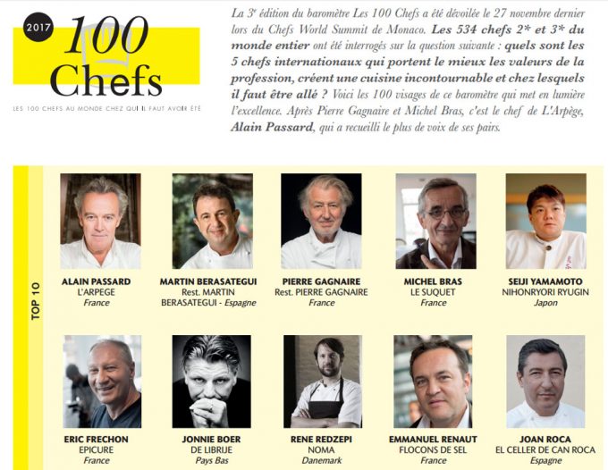 Hace un par de años, la revista francesa Le Chef daba a conocer la primera edición de la Lista de los 100 Mejores Chefs del Mundo, un ranking de cocineros cuya clasificación se obtiene mediante una encuesta y votación que realizan más de 500 cocineros procedentes de los cinco continentes y que son seleccionados por tener dos o tres estrellas Michelin. En su momento, los responsables de la revista explicaron que a pesar de que la guía roja pueda tener sus defectos, es una institución a nivel mundial en lo que respecta a la gastronomía, de ahí que la encuesta la realicen chefs con estrellas Michelin, considerados lo suficientemente competentes como para juzgar la calidad de un chef y de su restaurante.