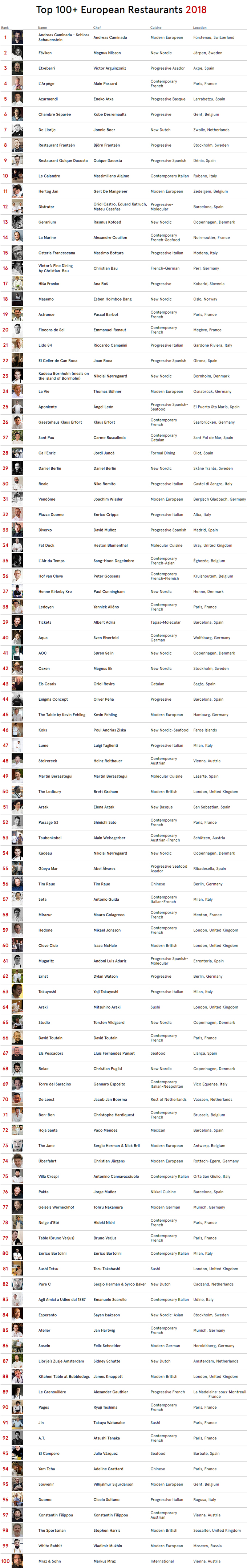 El Restaurante L’Arpège de Alain Passard ha descendido tres puestos en la clasificación y se sitúa en cuarta posición, el Restaurante Azurmendi de Eneko Atxa se clasifica en quinto lugar bajando una posición, en sexto lugar encontramos el Restaurante Chambre Séparée del chef Kobe Desremaults que aparece como novedad en el top 10, y en séptimo lugar el Restaurante De Librije de Jonnie Boer, que también desciende dos posiciones sobre la clasificación del 2017.