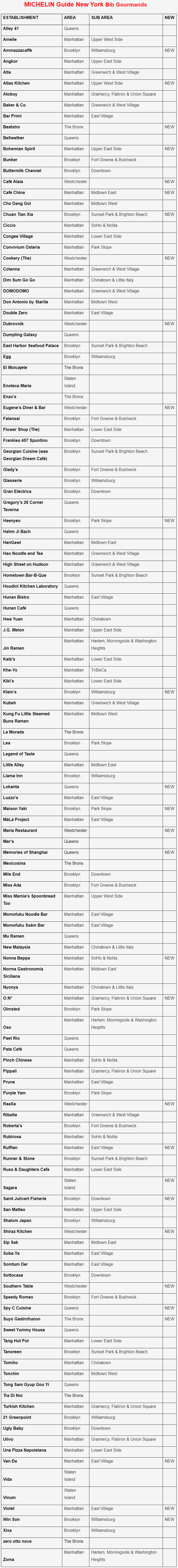Como el año pasado, reciben el distintivo aquellos establecimientos que ofrecen un menú correcto compuesto por un entrante, un plato principal, un postre o una copa de vino por un precio que no supera los 40 dólares (unos 36 euros según el cambio de moneda actual), sin incluir impuestos y propinas. Los restaurantes que han obtenido la distinción Bib Gourmand son: