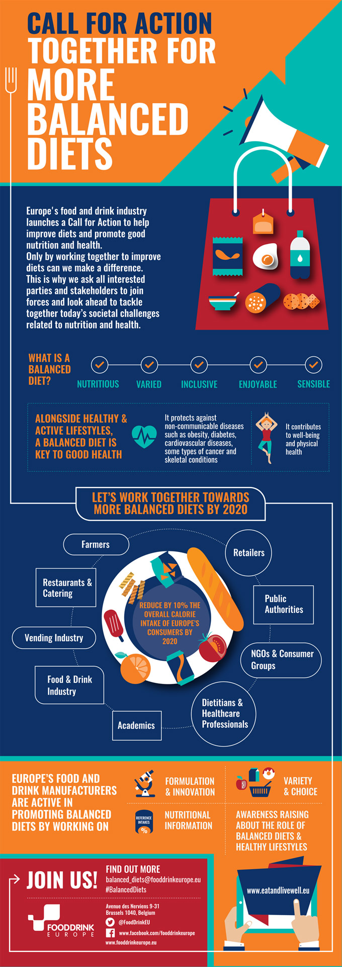 El presidente de la FoodDrinkEurope ha explicado que únicamente trabajando de la mano, se pueden marcar diferencias y acelerar el progreso, por ello realizan un llamamiento a las autoridades, al comercio minorista, a la restauración, a los agricultores, a los restaurantes, a los profesionales de salud pública, a los dietistas y nutricionistas, a las organizaciones no gubernamentales, etc., para unir fuerzas en favor de un objetivo común, mejorar la alimentación de todos los ciudadanos de la Unión Europea.