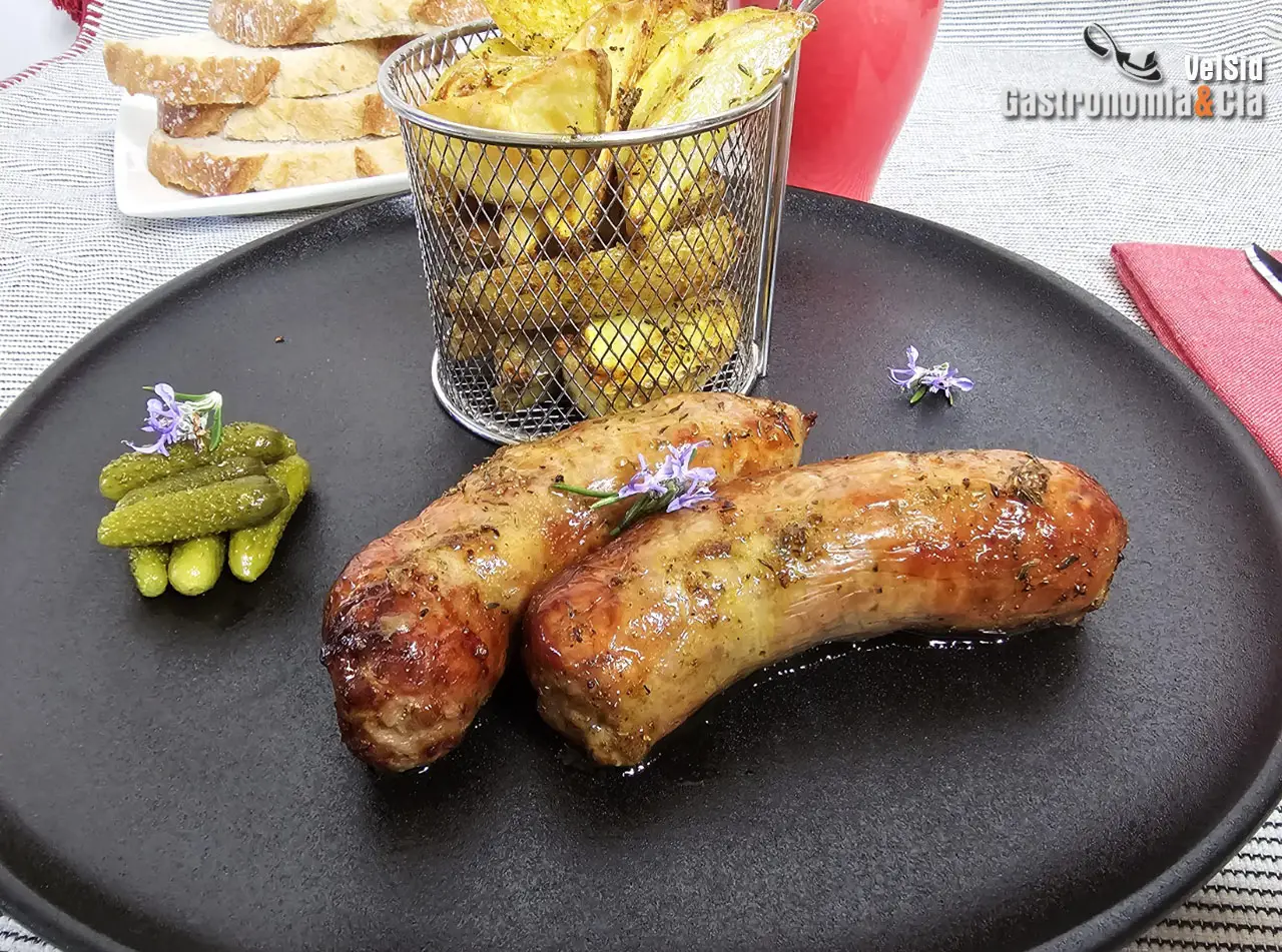 Cocina las patatas a 200º C sólo con sal y aceite unos 8 minutos, después añádeles las especias y aromáticas, así no se quemarán y potenciarán el sabor de las patatas con su aroma. Prepara las longanizas frescas, córtalas si están unidas entre ellas y pínchalas para que no exploten durante la cocción.