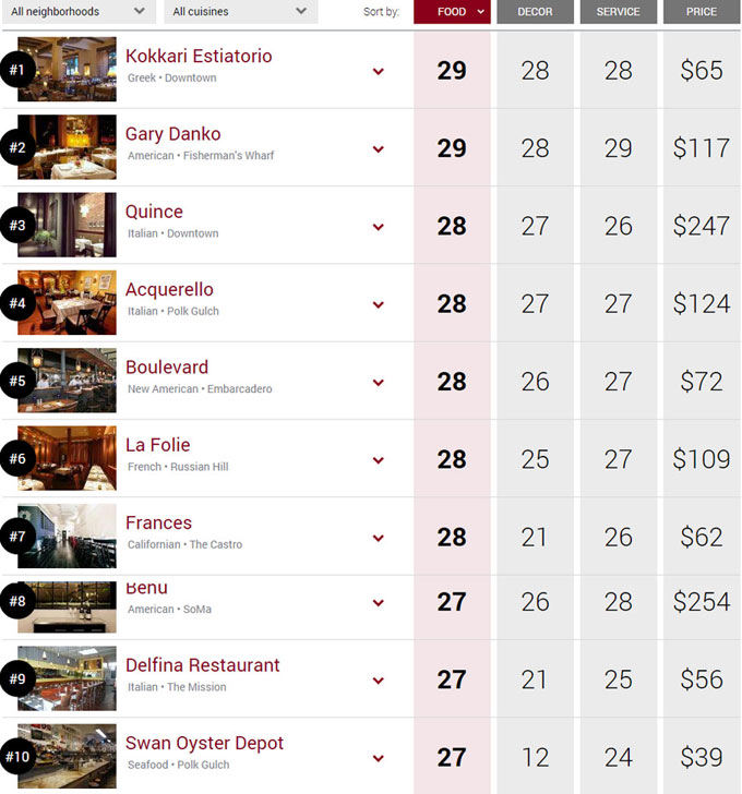 En la lista aparece en primera posición el Restaurante Kokkari Estiatorio, según la puntuación obtenida, en cada concepto logra rozar la perfección. En la guía Michelin San Francisco 2015 no recibe ninguna estrella y se considera un establecimiento Bib Gourmand, lo que muestra la disparidad de opinión entre comensales y críticos gastronómicos.