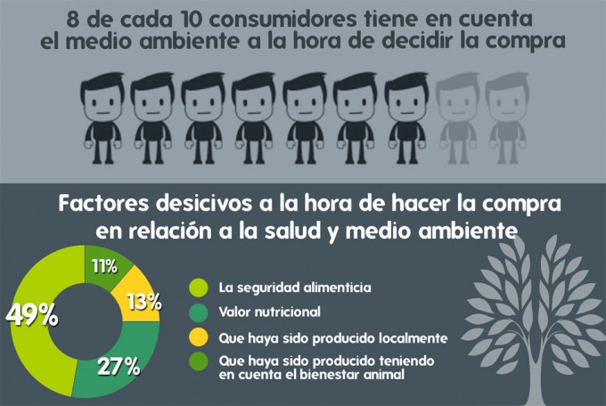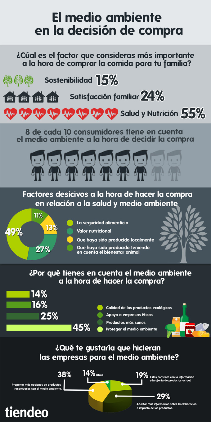 Según un estudio realizado por Tiendeo, los españoles tienen en cuenta el medio ambiente en sus compras de alimentos, 8 de cada 10 valoran que los fabricantes y el sector de la distribución se impliquen en la preservación del medio ambiente. En el estudio también se destaca que la seguridad alimentaria y el valor nutricional son dos de los factores más influyentes a la hora de realizar la elección de compra. Claro, que no se pueden generalizar los resultados, primero porque el estudio se ha realizado con los usuarios españoles del portal de ofertas locales, segundo porque la muestra es muy pequeña, tan sólo se han realizado 500 encuestas para llegar a las conclusiones indicadas y tercero más importante, no se ha introducido el precio de los alimentos como condicionante en las compras.