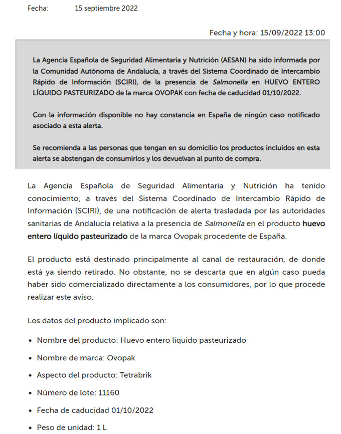 Y para conocer más detalles (aunque pocos dan) de la actual alerta alimentaria por el lote de huevo líquido pasteurizado OVOPAK, podéis entrar a la página de la AESAN pulsando aquí. Ya sabéis que si compartís esta noticia con quienes conocéis, será más fácil evitar posibles riesgos de toxiinfección.