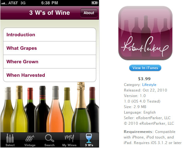 La aplicación se denomina Robert Parker’s 3 W’s of Wine y en ella se ofrece información sobre las características y particularidades de cada vino, tipo de uva, región vinícola de la que procede, nota de cata, consejos para poder disfrutar de los vinos en su plenitud, maridaje más adecuado, etc. Son vinos que pertenecen a diferentes regiones vinícolas del mundo y de diferentes añadas, pero hay que decir que la lista de vinos recomendados por Robert Parker no es muy extensa, la base de datos contempla poco más de 2.000 vinos, su manejo es sencillo y podemos realizar búsquedas por país, bodega, tipo de uva, etc.