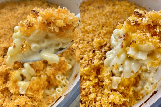 Preparar los ingredientes del gratinado crujiente mezclándolos, es importante que la mantequilla esté fundida y se mezcle muy bien con el panko y el queso rallado. Cubrir los macarrones con queso con este preparado y llevar al horno.