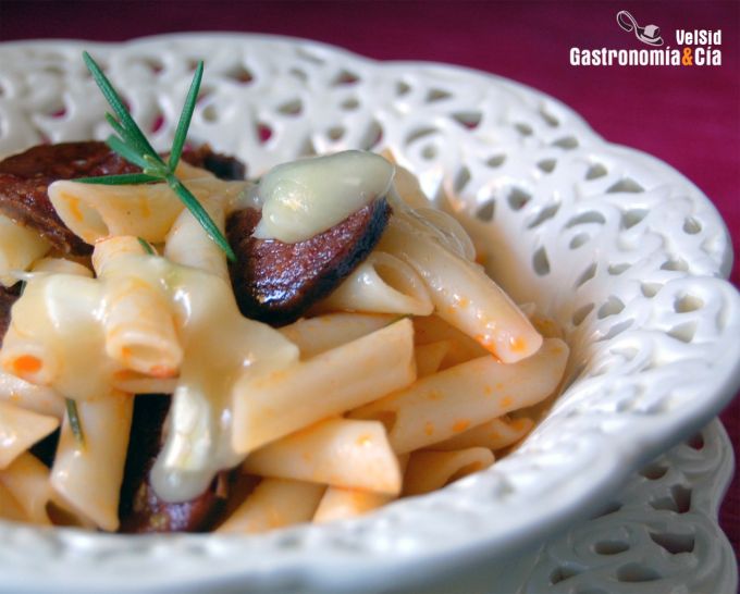 Mezcla los macarrones con el chorizo y su aceite para que la pasta se impregne bien y sirve. Reparte sobre los platos unos dados de queso rulo de cabra y fúndelos al calor, en el horno o en el microondas.