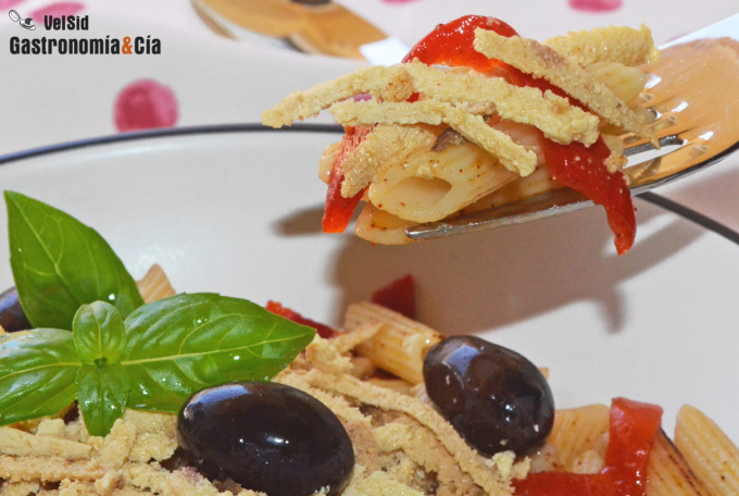 Sirve los macarrones con pimientos en los platos y reparte las aceitunas, la albahaca y el tofu ahumado rallado a modo de queso, aunque aparentemente discreto, infundirá mucho sabor a este plato de pasta. ¡Buen provecho!