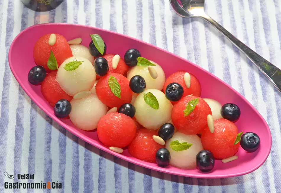 Si queréis ofrecer a vuestros comensales un postre a base de fruta, pero no sabéis cuál elegir o no queréis presentarla entera en la mesa, es muy fácil optar a elaborar una macedonia. Se pueden realizar infinidad de combinaciones, pero a veces lo más simple es lo que más se agradece o lo que más gusta. Nuestra propuesta de hoy es hacer una macedonia con tres frutas y algunos matices que la hacen deliciosa, a ver qué os parece esta macedonia de sandía, melón y arándanos con hierbabuena.