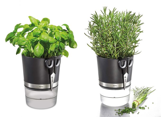 Esta maceta para hierbas aromáticas con autorriego y con sus tijeras especiales es de la firma Gefu, y garantiza que con el sistema de autorriego (con mecha de nylon), la planta recibirá siempre la cantidad de agua que necesite, y así se podrá disfrutar de hierbas aromáticas frescas siempre que se desee. Y lo cierto es que merece la pena, pues las hierbas secas que se venden en grandes superficies a menudo son poco aromáticas y de dudosa calidad. Y en el caso de comprar hierbas frescas en pequeños estuches, es fácil que se acabe tirando más de medio paquete porque se estropean antes de consumirse.