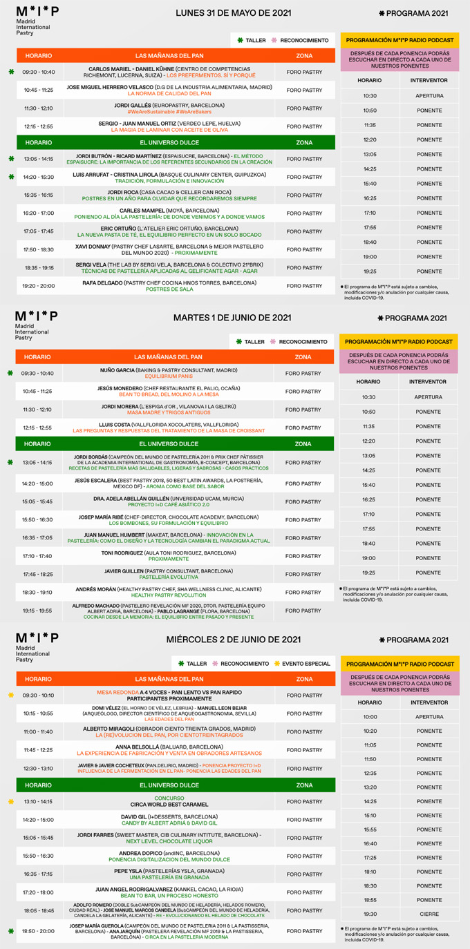 Como en su primera edición, Madrid International Pastry 2021 se presenta en tres bloques, Panadería, Pastelería y Chocolatería, pero en esta ocasión, no se dedica cada día del congreso a una disciplina, el formato cambia, como podréis ver a continuación. Es importante señalar que a esta edición de M*I*P se podrá asistir de forma presencial o vía streaming, pues todas sus actividades se retransmitirán en directo, y el periodo de inscripciones ya está abierto.