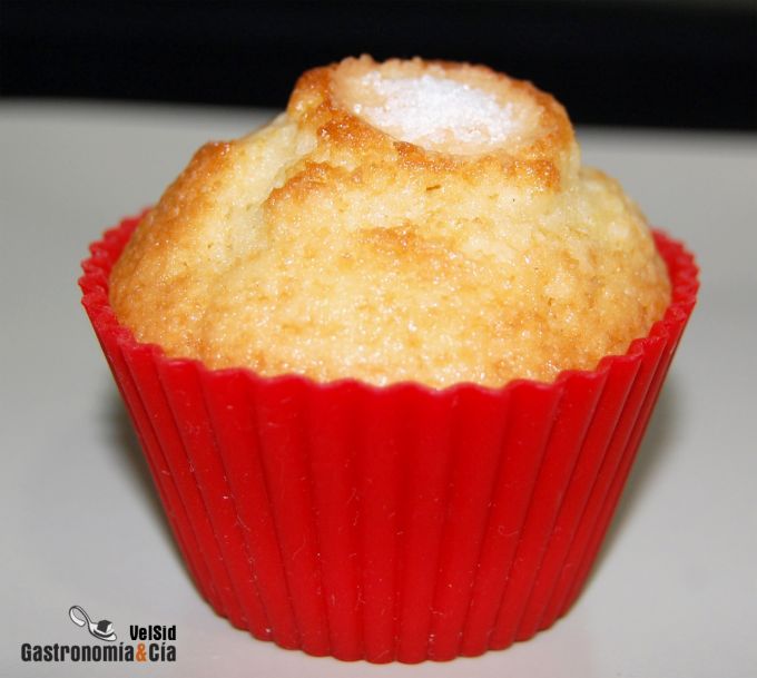 Vierte sobre cada magdalena media cucharadita de azúcar y déjala reposar unos diez minutos, a continuación introduce las magdalena en el horno bajando la temperatura a 180º C. Hornea diez minutos o hasta que hayan subido, entonces enciende también la parte de arriba del horno y deja unos minutos más, hasta que estén doradas.