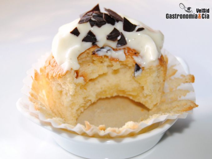 Prepara el frosting mezclando el queso mascarpone, el agua de azahar y el azúcar, bate bien hasta obtener una crema suave, y cubre con ella las magdalenas. Finalmente, decora con unas virutas de chocolate.
