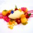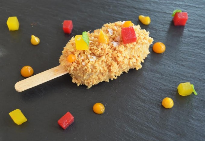 Servir en un plato de pizarra el Magnum de turrón y foie y condimentarlo con unas escamas de sal Maldon. Acompañar con la calabaza confitada, la gelatina de naranja, unas gotas de esencia de almendras y unas hojas de hierbabuena.