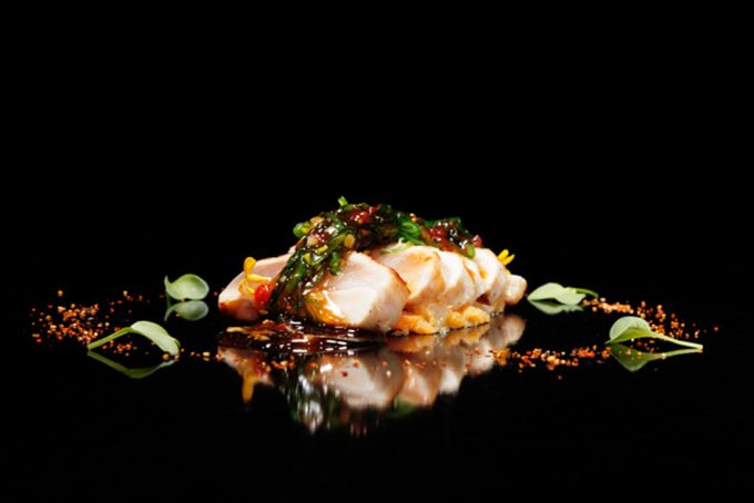 Ponemos en el fondo del plato una cucharada de la patata rota bien caliente. Encima colocamos el magret de pollo laminado. Culminamos con la ensalada de algas cubriendo el pollo y napamos con el adobo del pollo. ¡A disfrutar!