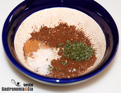 Como hay ingredientes enteros y otros ya molidos, empieza triturando los primeros, la pimienta, el ajo (nosotros hemos partido de un ajo seco entero hecho en casa), el café y el azúcar que ayudarán también a ‘romper’.