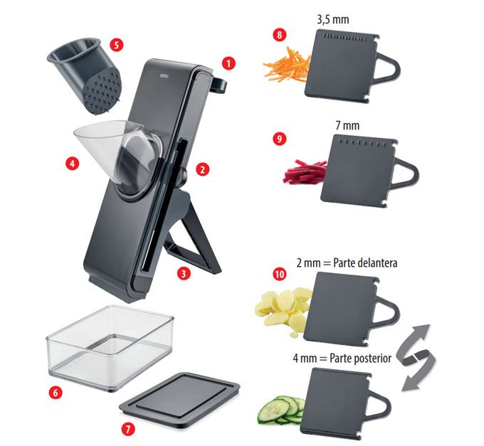 Bajo estas líneas podéis ver todas las piezas que componen la cortadora de vegetales Stando, una base plegable, una tolva de llenado, un recipiente para recoger los alimentos de 500 ml de capacidad, una tapa para el recipiente, un mango para mover la hoja integrada, y dos placas de corte de doble uso, es decir, hay una placa para cortar en juliana que por un lado corta a 3’5 mm y por el otro a 7 mm. Mientras que la placa de corte para hacer rodajas tiene otras dos medidas, 2 mm y 4 mm.
