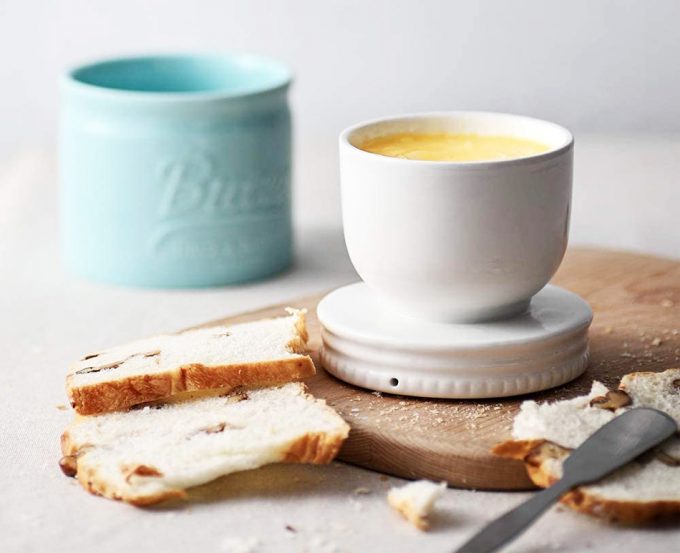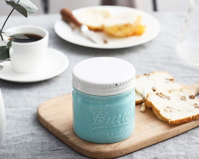 El diseño de esta mantequillera de estilo francés (Beurrier à eau) es un guiño a los clásicos tarros de conservas conocidos como ‘Mason Jar’, está fabricada en porcelana, por lo que puede lavarse en el lavavajillas y en caso de necesidad se podría introducir en el microondas, en el horno y en el congelador sin problemas. En cuanto a la capacidad de mantequilla que ofrece, el fabricante habla de una barra, pero no se refiere a las que encontramos normalmente en España, son barras más finas, de unos 113 gramos, aproximadamente la mitad de lo que llevan las barras rectangulares de nuestros comercios.