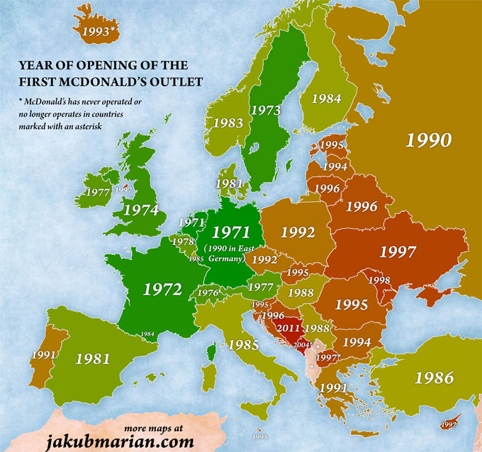 McDonald’s se fundó el 15 de mayo de 1940 en San Bernardino (California), fue expandiéndose poco a poco en Estados Unidos y tardó 30 años en llegar a Europa. El mapa elaborado por Jakub Marian es un modo rápido de poder ver cómo fue creciendo la cadena en el viejo continente, en definitiva, una curiosidad para algunos lectores.