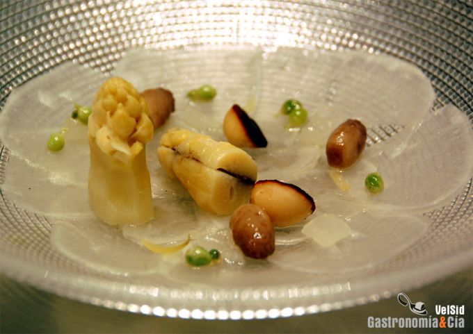 Empieza laminando el nabo (asturiano o daikon), para disminuir el sabor picante lo pone en remojo 24 horas en agua con hielo, después lo aliña con aceite de argán, vino blanco y sal. También corta unos dados de nabo que después de escaldarlos, los deja reposar en aceite de argán. El plato quiere ofrecer también dos texturas de espárragos, uno es en conserva, lo abre por la mitad en plan bocadillo y lo rellena con trufa negra. El otro espárrago es fresco, de temporada, lo escalda y lo ofrece con su sabor natural. En el montaje del plato incorpora también unos guisantes lágrimas macerados en aceite de argán, unos brotes de fabes, láminas de lima tailandesa en salazón, aceite de trufa blanca… ¿queréis probarlo?.