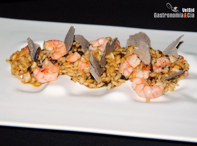 Embriagador el Arroz con gambas rojas y trufa blanca de verano que Robert y María José San Román prepararon durante la ponencia, pero su degustación aún fue mejor (pudimos probarlo), a pesar de que la temperatura del fuego no era la adecuada, imaginad si tomamos en su casa un arroz con sofrito de calamar que incorpora directamente al caldo para evitar que se hagan grumos, al arroz le incorpora previamente el azafrán en infusión, ya ha tomado color y lo conservará. Añade el caldo, lleva a ebullición y termina la cocción en el horno. Pero el arroz no está terminado, al final incorpora unas gambitas al ajillo, salteadas en aceite de oliva virgen extra de la variedad picual, y en la receta de este día, trufa blanca de verano. ¿Gustáis?