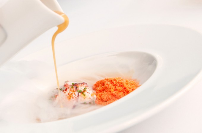 En plato sopero colocar la patata cocida caliente, encima disponer el pulpo a modo de carpaccio y espolvorear cebollino picado. Calentar la crema de marmitako a unos 70º C, dar un pequeño golpe de nitrógeno a los pequeños cristales de aceite de pimentón, colocar una cucharadita de aceite en un lateral y servir inmediatamente la crema templada sobre el nitrógeno, para crear efecto de humo.