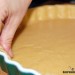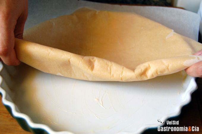 Pasado este tiempo, estira la masa quebrada con el rodillo de cocina, procura hacerlo lentamente para que la masa no adquiera temperatura, pues se volvería a ablandar. Colócala a continuación sobre el molde untado con mantequilla, para que el paso de la masa al molde sea más sencillo, puedes hacerlo con la ayuda de una hoja de papel de horno, enrollando la masa en el papel y desenrollándola sobre el molde, como se puede ver en la galería de imágenes.