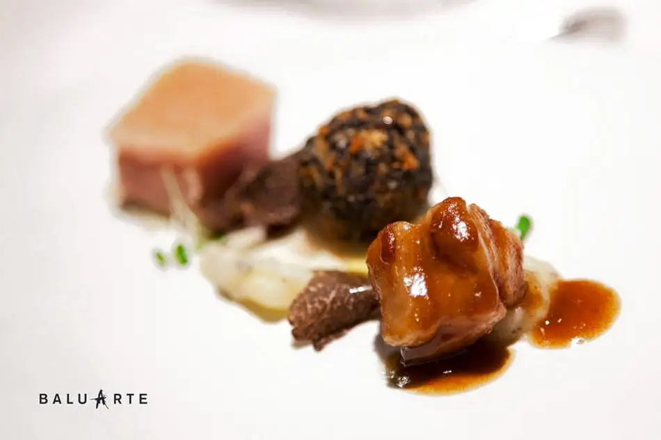 El Restaurante Baluarte de Soria, reconocido con una estrella Michelin, cumple diez años en los que los reconocimientos a su chef y a su cocina han sido una constante. Óscar García tiene un estilo propio enmarcado en el territorio en el que se ubica, por lo que es fácil adivinar que las setas y las trufas (Tuber Melanosporum) son una de sus banderas, como lo es la cocina de producto y de proximidad, con la que pone la naturaleza en el plato. Hoy os traemos uno de sus platos, uno de los que impregnan de aromas su comedor, se llama Matanza con parmentier de trufa.