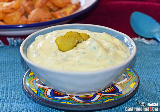 Escurre el pepinillo y pícalo bien fino, añádelo a la mahonesa. Lava y seca el cebollino, el romero, el tomillo y la albahaca, pica las hojas bien finas e incorpóralas a la salsa. Añade también las hierbas secas elegidas, en este caso estragón, mejorana y perifollo, y mezcla bien. Prueba para rectificar de sal o de alguna hierba aromática si lo deseas. También puedes añadir una pizca de pimienta y una pizca de zumo de limón.