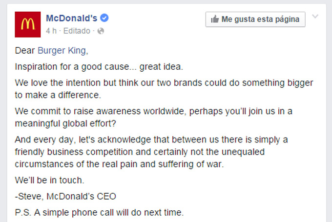 Da la impresión de que la franquicia de comida rápida menosprecia la iniciativa, evidentemente no se puede comparar una “guerra” entre franquicias con las actuales guerras que causan dolor y sufrimiento, pero quizá debería haber aceptado la propuesta. El CEO firma con un ‘estaremos en contacto’ y recuerda a Burger King que la próxima vez es mejor que primero llame por teléfono. Parece evidente que a McDonald’s no le gustan las sorpresas y menos si proceden de la competencia, por lo que ya podemos decir que la hamburguesa Mc Whopper no se creará y no veremos a las dos compañías unidas celebrando el Día Mundial de la Paz.